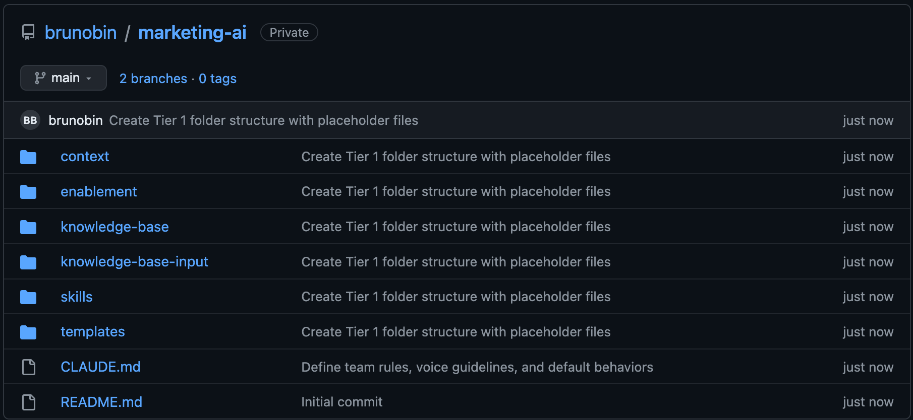 “Clone my GitHub repository at github.com/[your-username]/marketing-ai and create the full Tier 1 folder structure: context/brand/, context/products/, context/audience/, context/competitive/, skills/, templates/, enablement/, knowledge-base/, knowledge-base-input/. Add a placeholder .md file in each folder. Commit and push.”