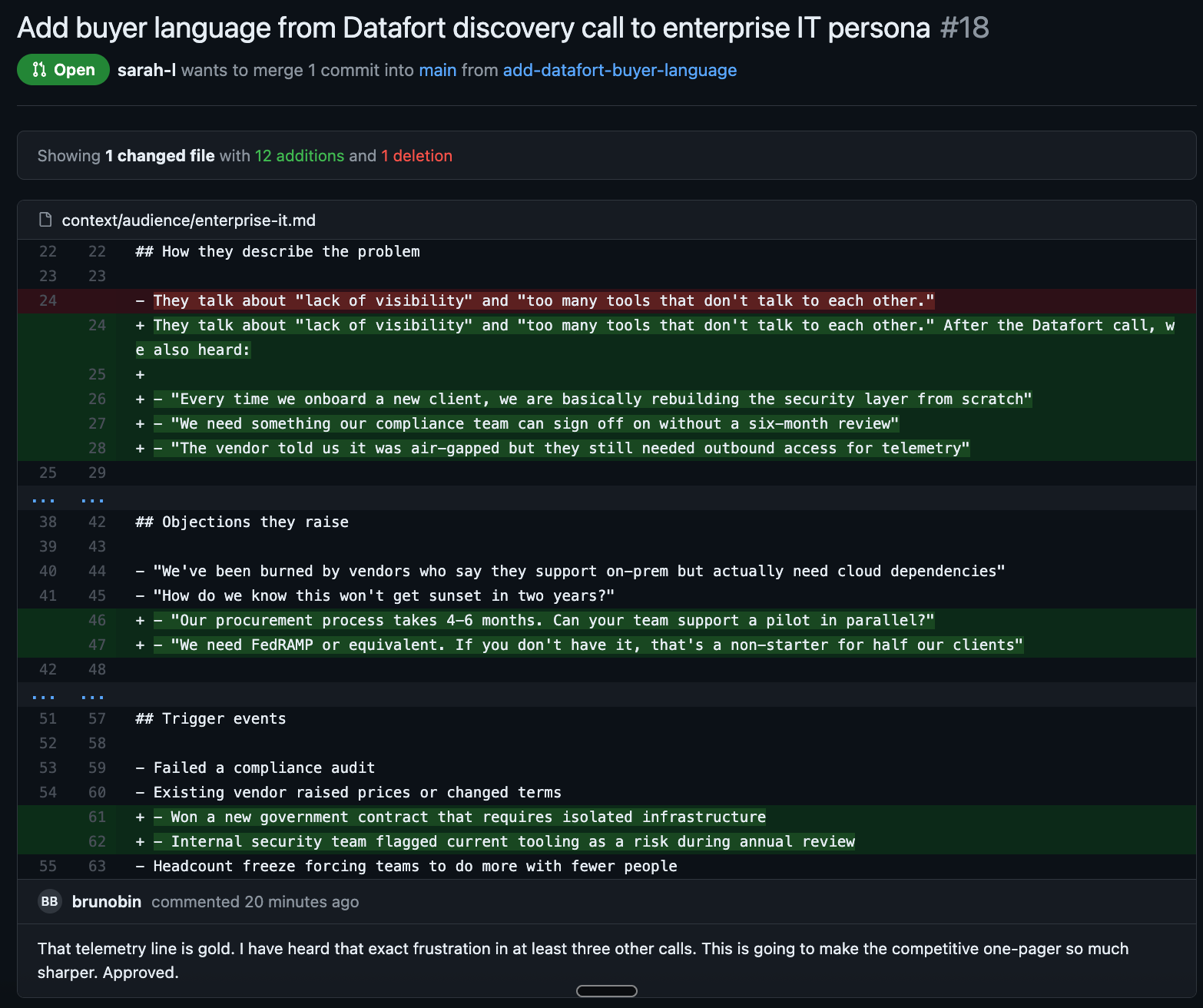 If you have access to Gong or call recordings, listen to three or four discovery calls and write down the exact phrases buyers use. That language goes in this file.