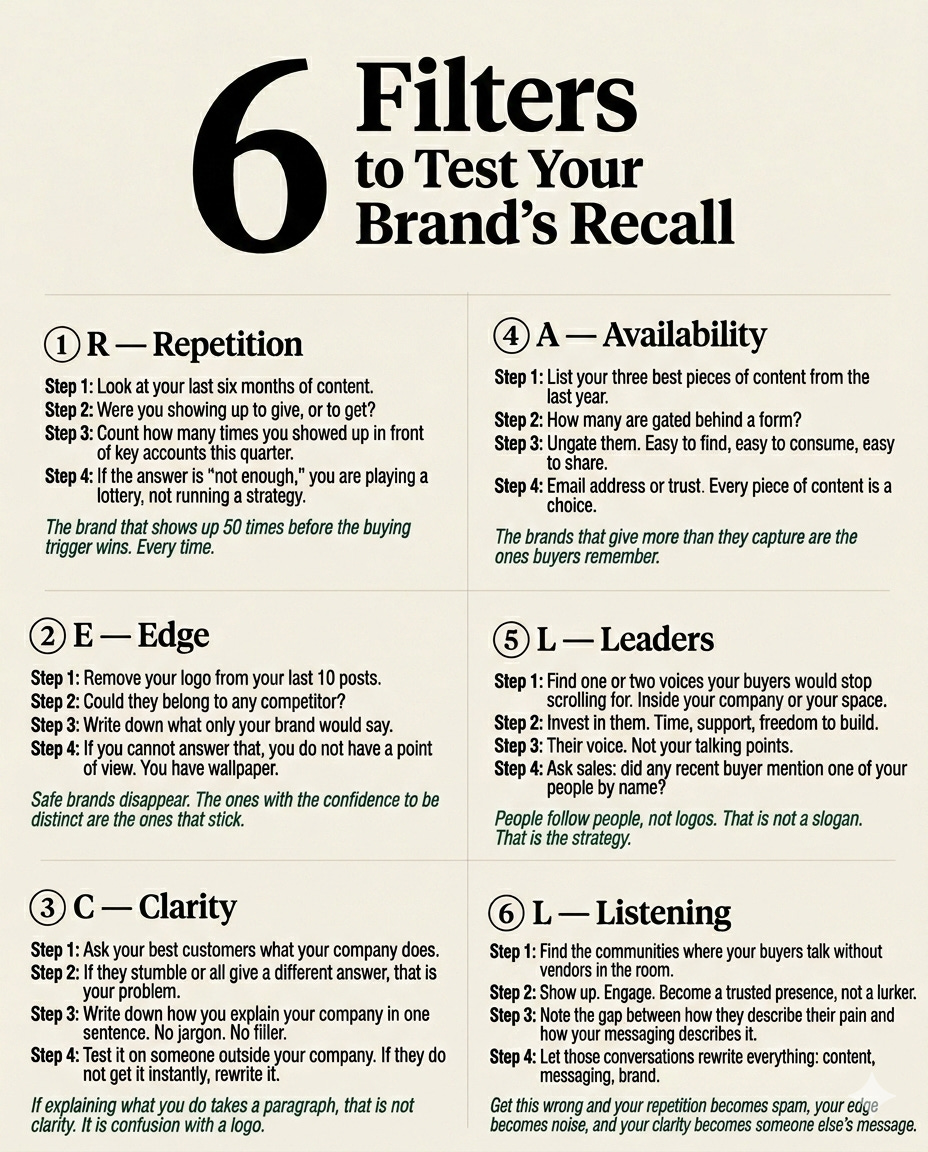 Are you showing up often enough to be automatic, or just often enough to check a box? Do you have a point of view that actually stands out, or are you blending in and calling it “professional”? Can a buyer explain what you do in one sentence? Is your best thinking easy to access, or locked behind a form? Are there real humans at your company building trust with your audience, or is everything coming from a logo? And do you actually understand your buyer’s world, or are you guessing?